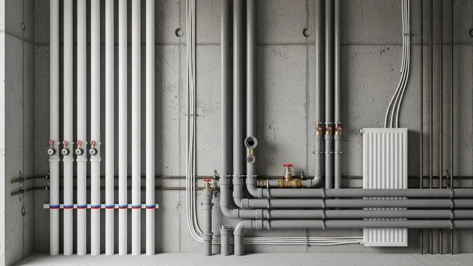 - سیستم فاضلاب: به طور سنتی از لولههای پلیکا (PVC خاکستریرنگ) یا نسل جدیدتر و بیصدای آنها یعنی «پوشفیت» (Push-Fit) استفاده میشود. اتصالات پوشفیت دارای سوکت و واشر لاستیکی هستند و نصب آنها نیازی به چسب ندارد.