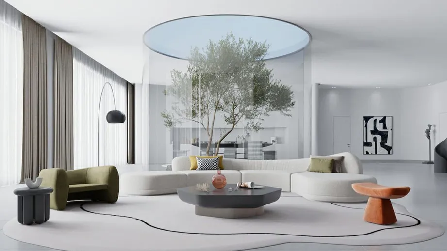 - خطوط منحنی: استفاده از مبلمان، طاقها، آینهها و جزیرههای آشپزخانه با لبههای گرد و منحنی به جای خطوط تیز و گونیا. این فرمها حس نرمی، امنیت و جریان را در فضا ایجاد میکنند.
