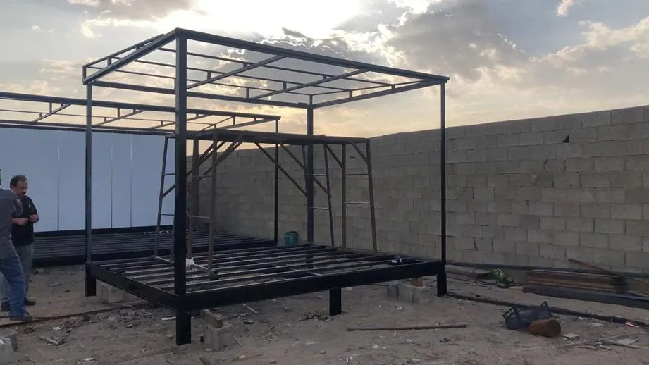 ۲. اسکلت: ستونها و تیرها از پروفیلهای آهنی (قوطی) با ضخامتهای مختلف (معمولاً ۴۰×۴۰ و ۴۰×۸۰ میلیمتر) ساخته میشوند. ضخامت پروفیل (۱.۵ یا ۲ میلیمتر) تأثیر مستقیم بر قیمت و دوام دارد. اتصالات با جوش ممتد CO2 یا الکترود انجام میشود و سپس با ضدزنگ پوشانده میگردد.