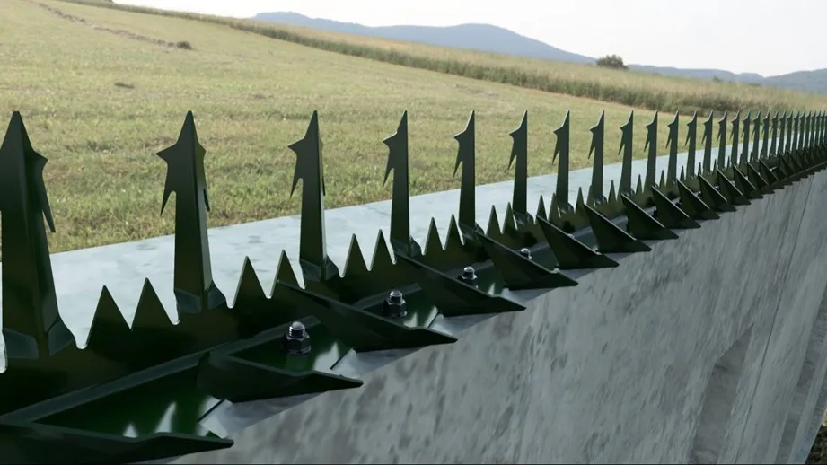 - ساختار فنی: این حفاظ از میلگردهای فولادی (معمولاً سایز ۱۰ میلیمتر) ساخته میشود. میلگردها در قطعات کوچک برش خورده و نوک آنها با دستگاه گیوتین به صورت مورب و بسیار تیز (مثل چاقو) درمیآید. سپس این قطعات با الگویی خاص به یکدیگر جوش داده میشوند تا یک شبکه درهمتنیده ایجاد کنند.