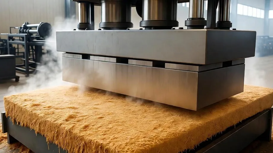 مرحلهی حیاتی بعدی، «خشککن» است. در این مرحله، رطوبت الیاف که حدود ۵۰ درصد است، به شدت کاهش یافته و به حدود ۶ تا ۱۲ درصد میرسد. این کار برای موفقیت پرس نهایی ضروری است؛ زیرا اگر رطوبت زیادی در الیاف باقی بماند، هنگام قرار گرفتن در پرس داغ (با دمایی نزدیک به ۲۰۰ درجه سانتیگراد)، بخار آب پرفشار حاصله باعث جدا شدن لایههای داخلی تخته میشود. پس از خشک شدن، الیاف به چسب رزین و پارافین (برای ایجاد مقاومت اولیه در برابر آب) آغشته شده، به صورت یک «کیک» ضخیم روی هم انباشته میشوند و در نهایت زیر پرس داغ قرار میگیرند تا به تختهی متراکم نهایی تبدیل شوند. همین فرآیند، نقطهی ضعف اصلی ام دی اف را نیز آشکار میکند؛ این محصول که با حذف کامل رطوبت ساخته میشود، در حالت خام، به شدت جاذب آب است و نفوذ مجدد رطوبت، پیوند رزین را شکسته و باعث تورم یا «باد کردن» آن میشود.