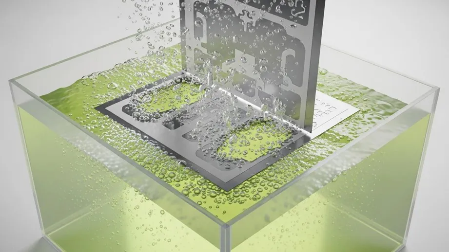 - اچینگ: قطعه در محلول شیمیایی غوطهور میشود تا مواد از بخشهای بدون ماسک حل شوند.