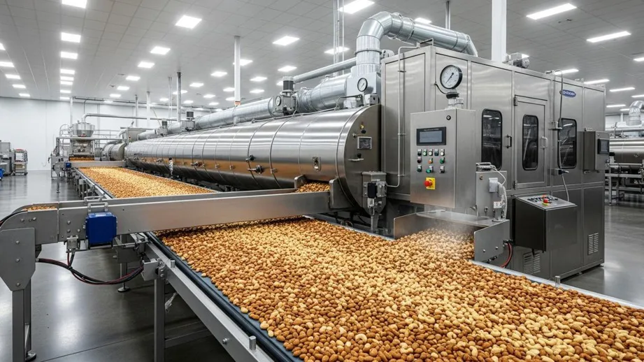 این دستگاهها برای تولید در مقیاس بسیار بالا و استفاده در کارخانههای فرآوری و بستهبندی خشکبار طراحی شدهاند. ظرفیت تولید دستگاه تفت آجیل صنعتی معمولا بسیار بالا بوده و میتواند از ۱ تا ۴ تُن محصول را در هر شیفت کاری تفت دهد. این مدلها اغلب از نوع «تونلی» (Tunnel) هستند؛ به این معنی که محصول به صورت پیوسته بر روی یک نوار نقاله از درون یک تونل حرارتی طولانی عبور کرده و در انتهای مسیر به صورت برشتهشده خارج میشود. این دستگاهها به دلیل ابعاد و توان مصرفی بالا، تقریبا همیشه به برق سهفاز صنعتی نیاز دارند.