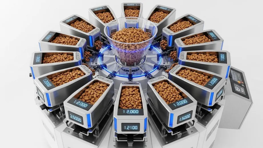 در مقابل، سیستمهای توزین، وزن دقیق محصول را قبل از بسته بندی اندازهگیری میکنند. این روش برای محصولات گرانقیمت مانند آجیل یا زعفران که دقت بالا در آنها حیاتی است، ضروری به شمار میرود. اوج این فناوری، در سیستمهای «توزین چند سر» (Multi-head Weigher) دیده میشود. در این سیستم، چندین ترازوی کوچک به طور همزمان، بخشهای کوچکی از محصول را وزن میکنند. سپس یک کامپیوتر، بهترین «ترکیب» از این بخشهای کوچک را برای رسیدن به وزن هدف دقیق، محاسبه میکند. این نوآوری توانسته است سرعت بالا را با دقت بالا ترکیب کند و محدودیت قدیمی بین این دو را از میان بردارد.