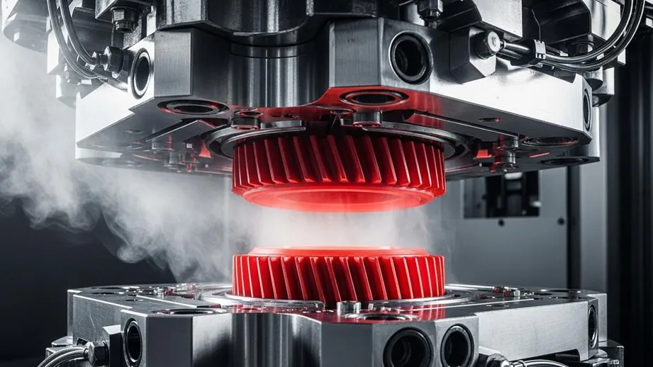 ۲. تزریق (Injection): گرانولهای پلاستیک از طریق یک قیف وارد سیلندر دستگاه میشوند. در آنجا، یک ماردون (پیچ) چرخان همزمان با گرم شدن توسط المنتهای حرارتی، مواد را ذوب کرده و به سمت جلو هدایت میکند. سپس پلاستیک مذاب با فشار شدید به داخل فضای خالی قالب تزریق میشود.
