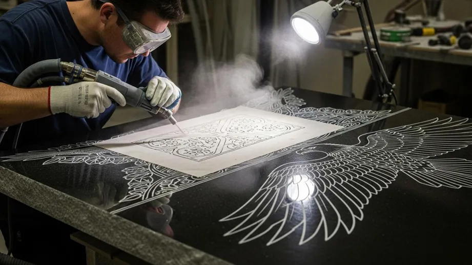 مشابه فرایندی که برای شیشهی طرحدار استفاده میشود، میتوان از سندبلاست برای حکاکی و برجستهکاری روی سطوح سخت دیگری مانند سنگ، کاشی و سرامیک بهره برد. با استفاده از شابلونهای مقاوم، میتوان انواع نوشتهها، لوگوها و نقشهای تزئینی را روی این سطوح ایجاد کرد. این کاربرد به ویژه در ساخت تابلوهای سنگی، کتیبهها و دکوراسیونهای تجاری رایج است.