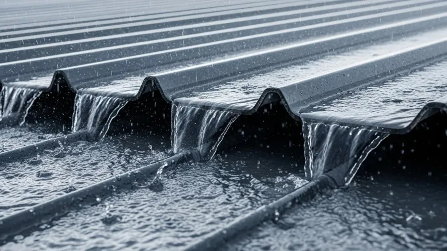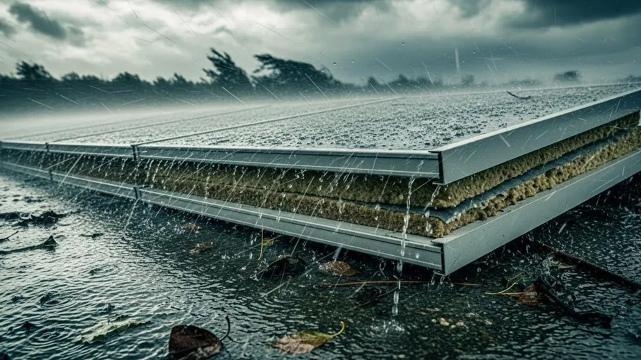 سقف سازه همیشه در معرض شدیدترین عوامل جوی مانند بارش باران، برف و تابش مستقیم نور خورشید قرار دارد. ساندویچ پانل سقفی با طراحی متفاوت و دارای گامهای بلند (ذوزنقهای یا شادولاین) تولید میشود. وجود این گامها دو مزیت اصلی دارد: اول اینکه مقاومت خمشی پنل را در برابر بارهای سنگین مثل برف بالا میبرد و دوم اینکه کانالهایی برای هدایت و تخلیه سریع آب باران ایجاد میکند.