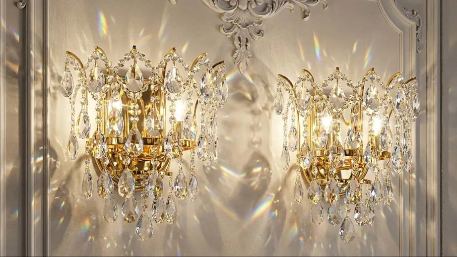 وقتی صحبت از درخشش خیرهکننده باشد، چراغ دیواری لوکس وارد میدان میشود. این مدلها تماماً یا بخش بزرگی از آنها از کریستالهای تراشخورده (مانند برندهای عصفور یا سواروسکی) تشکیل شده است. شکست نور در منشورهای کریستالی، بازی رنگی زیبایی روی دیوار ایجاد میکند. بدنههای این چراغها اغلب با طلاکاریهای ۲۴ عیار یا کروم بسیار براق پوشیده شده تا در کنار لوسترهای بزرگ، شکوه فضا را تکمیل کنند.