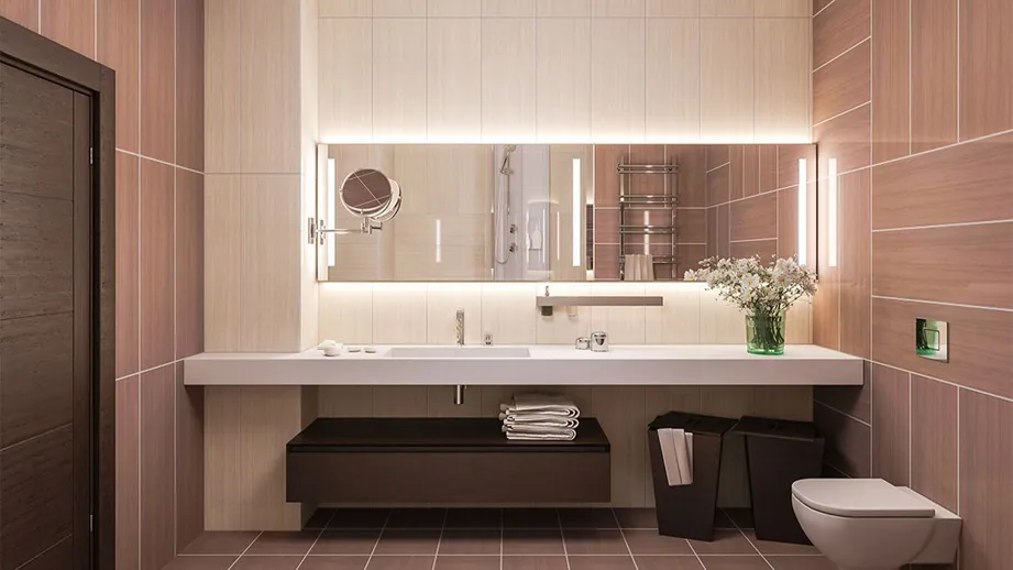 - ارتفاع در سرویس بهداشتی: برای چراغهای فلنک (Flank) یا دو طرف آینه، مرکز چراغ باید دقیقاً در ارتفاع چشم کاربر (حدود ۱۶۰ تا ۱۷۰ سانتیمتر) باشد تا سایهها حذف شوند.