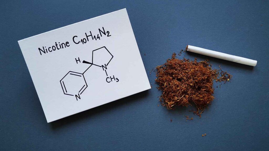 نیکوتین یک آلکالوئید طبیعی به شمار می‌رود که عمدتا در گیاه تنباکو یافت می‌شود و به‌ عنوان ماده اصلی ایجاد وابستگی در سیگار و سایر محصولات دخانی شناخته می‌شود. این ترکیب شیمیایی، محرک سیستم عصبی مرکزی است و پس از مصرف سریعا وارد جریان خون شده و به مغز می‌رسد. این ماده موجب آزاد شدن مواد شیمیایی مانند دوپامین می‌شود که احساس لذت و رضایت موقتی را ایجاد می‌کنند و همین مکانیسم باعث ایجاد وابستگی روانی و جسمی به آن می‌شود.